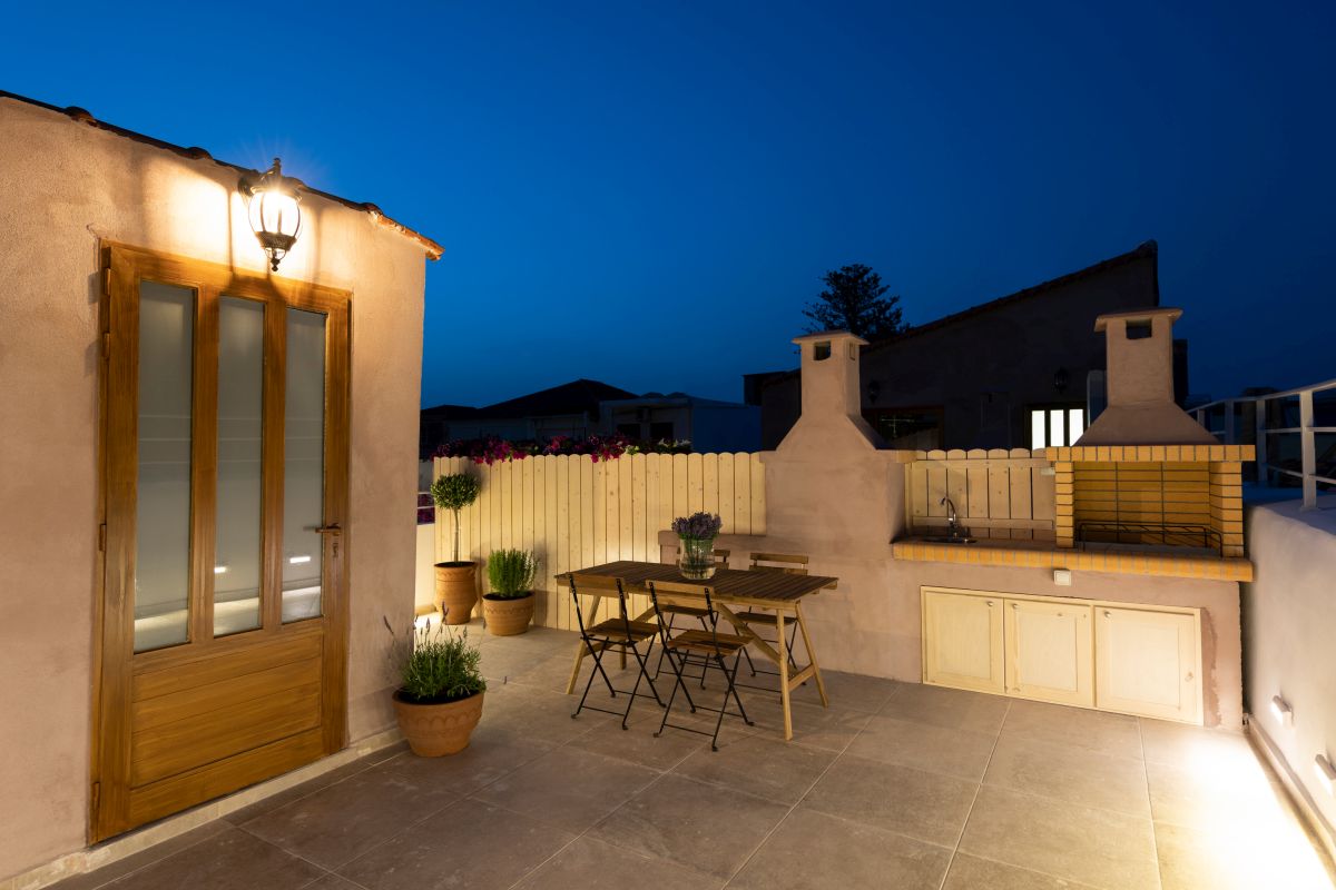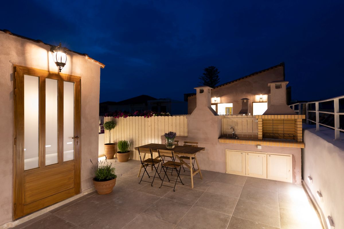 The apartment features a delightful roof terrace—a private roof garden with a charcoal BBQ—accessible directly and privately from the balcony, offering an ideal spot for enjoying warm summer evenings. The BBQ invites you to savor the flavors of Cretan Mediterranean cuisine, renowned for its healthfulness and popularity. For those seeking fresh ingredients, the open market in Rethymno city offers high-quality traditional products perfect for culinary creations.