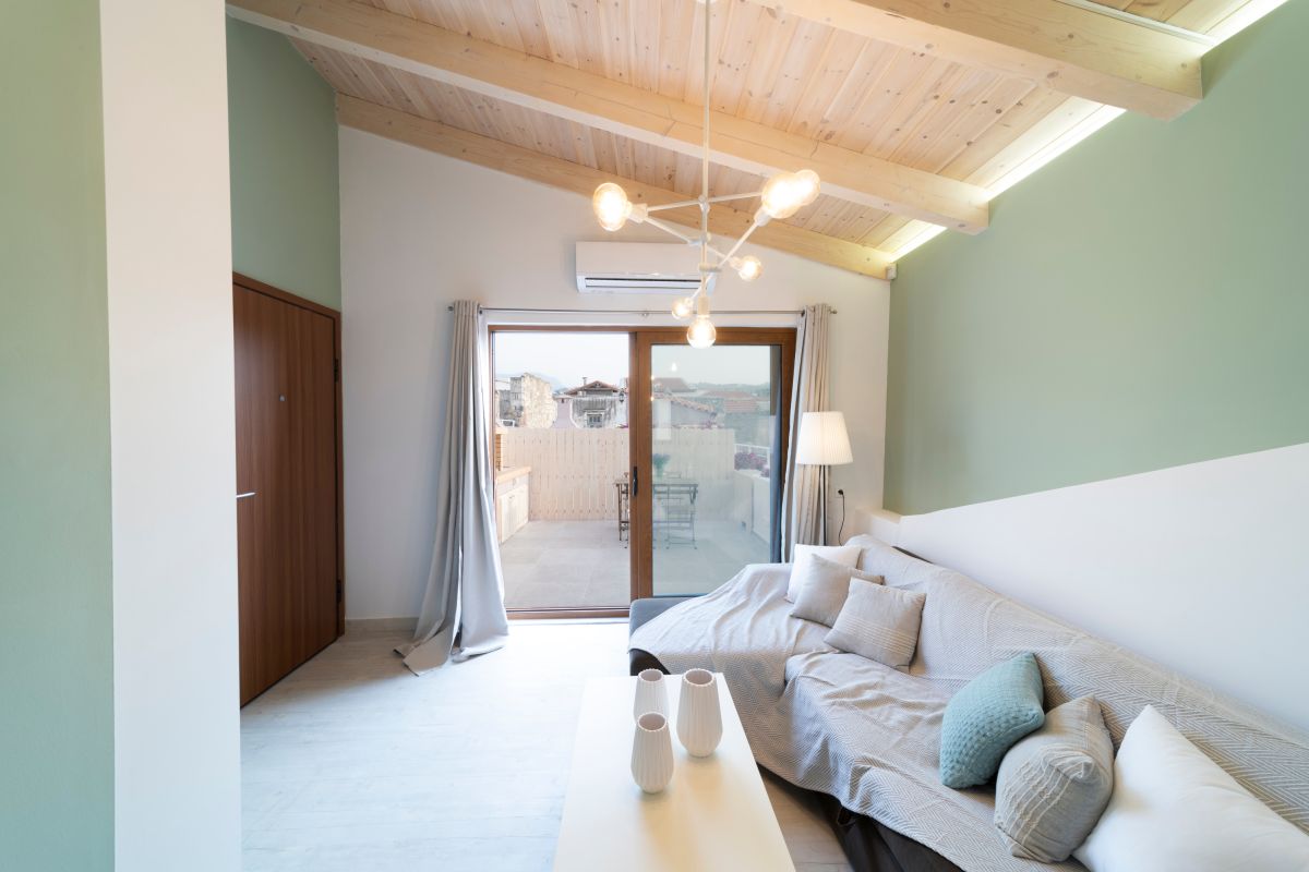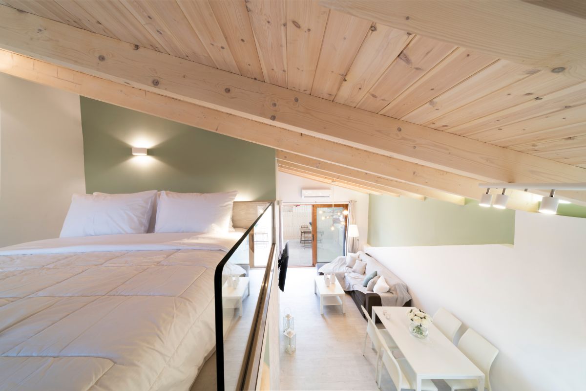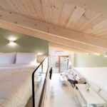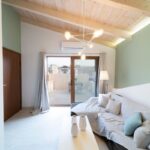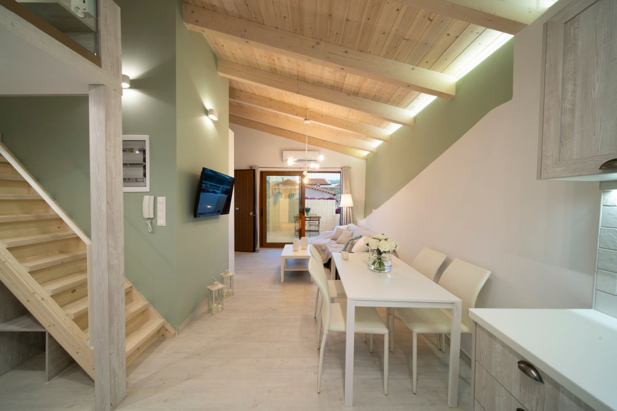 The Loft, situated on the second floor in the attic, spans 45m2 and has been tastefully renovated in a modern design, complete with full air conditioning. It features a comfortable double bed (1.60×2.00m) and a sofa-bed that can accommodate an additional 2 guests when converted into a double bed. The bathroom is equipped with a shower and a convenient washing machine. The fully equipped kitchen ensures your culinary needs are met.