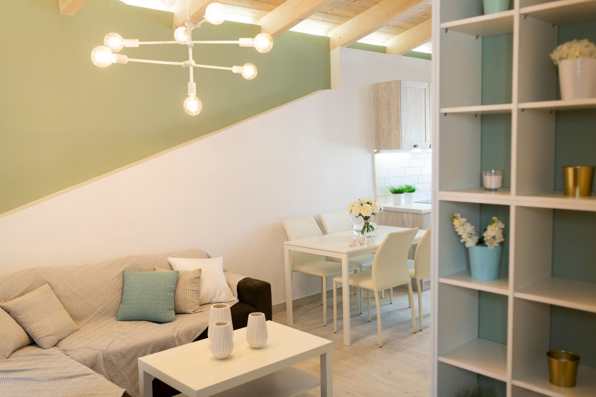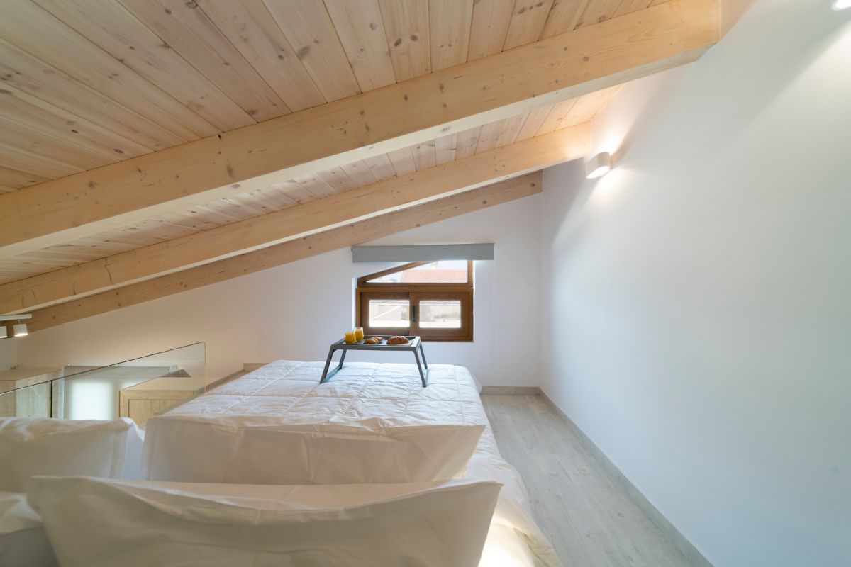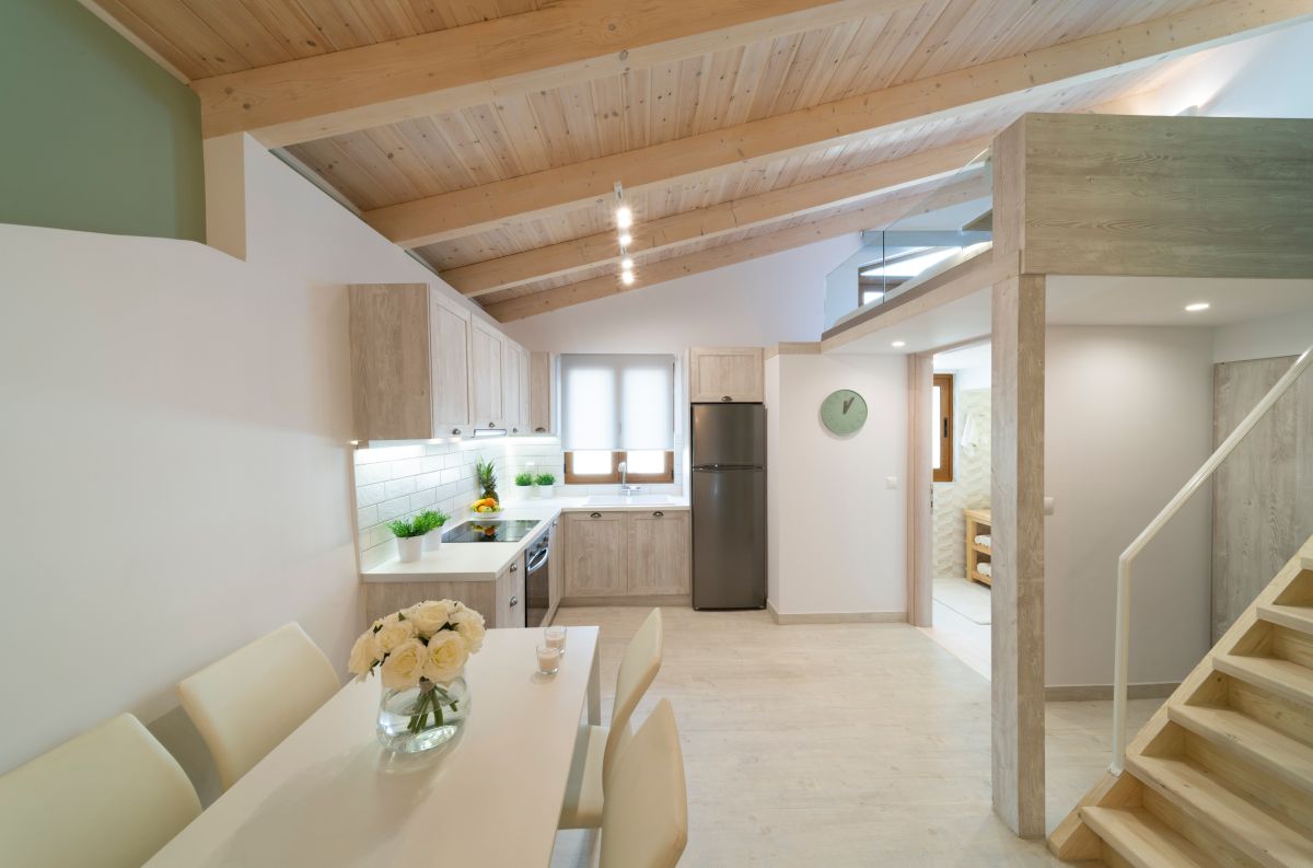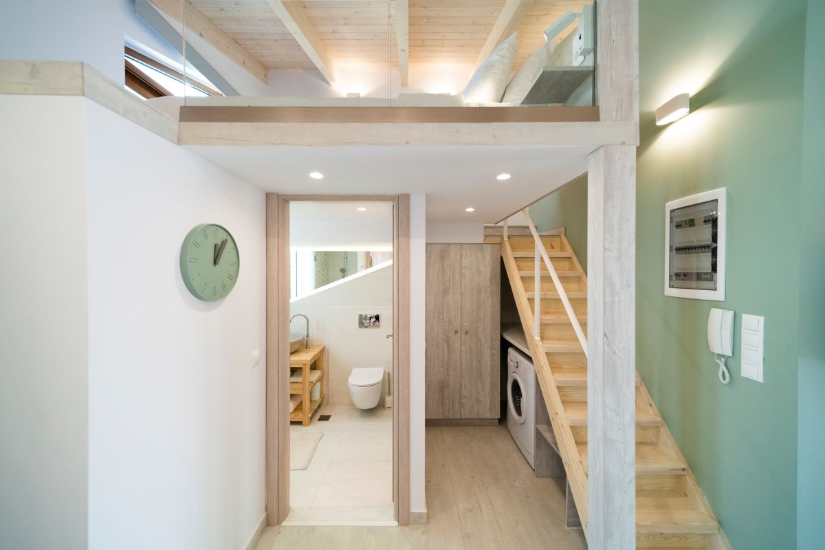The Loft, situated on the second floor in the attic, spans 45m2 and has been tastefully renovated in a modern design, complete with full air conditioning. It features a comfortable double bed (1.60×2.00m) and a sofa-bed that can accommodate an additional 2 guests when converted into a double bed. The bathroom is equipped with a shower and a convenient washing machine. The fully equipped kitchen ensures your culinary needs are met.