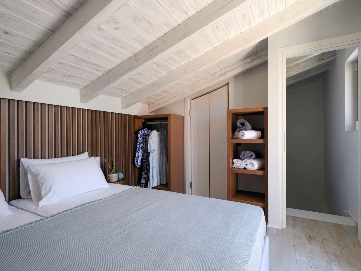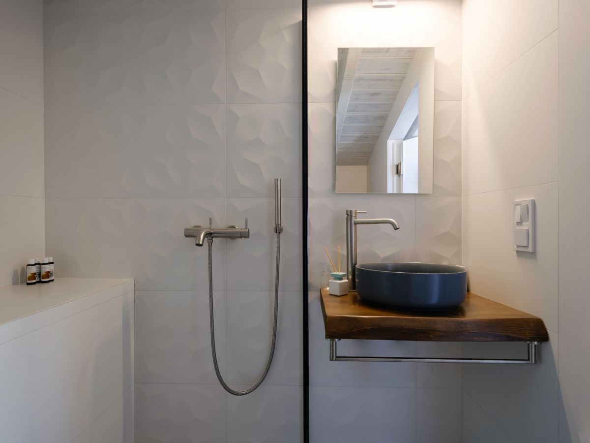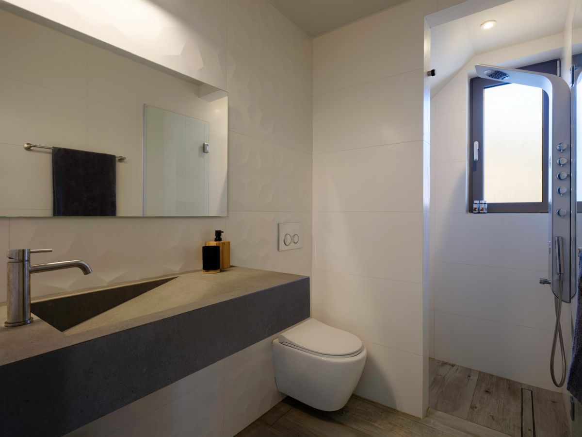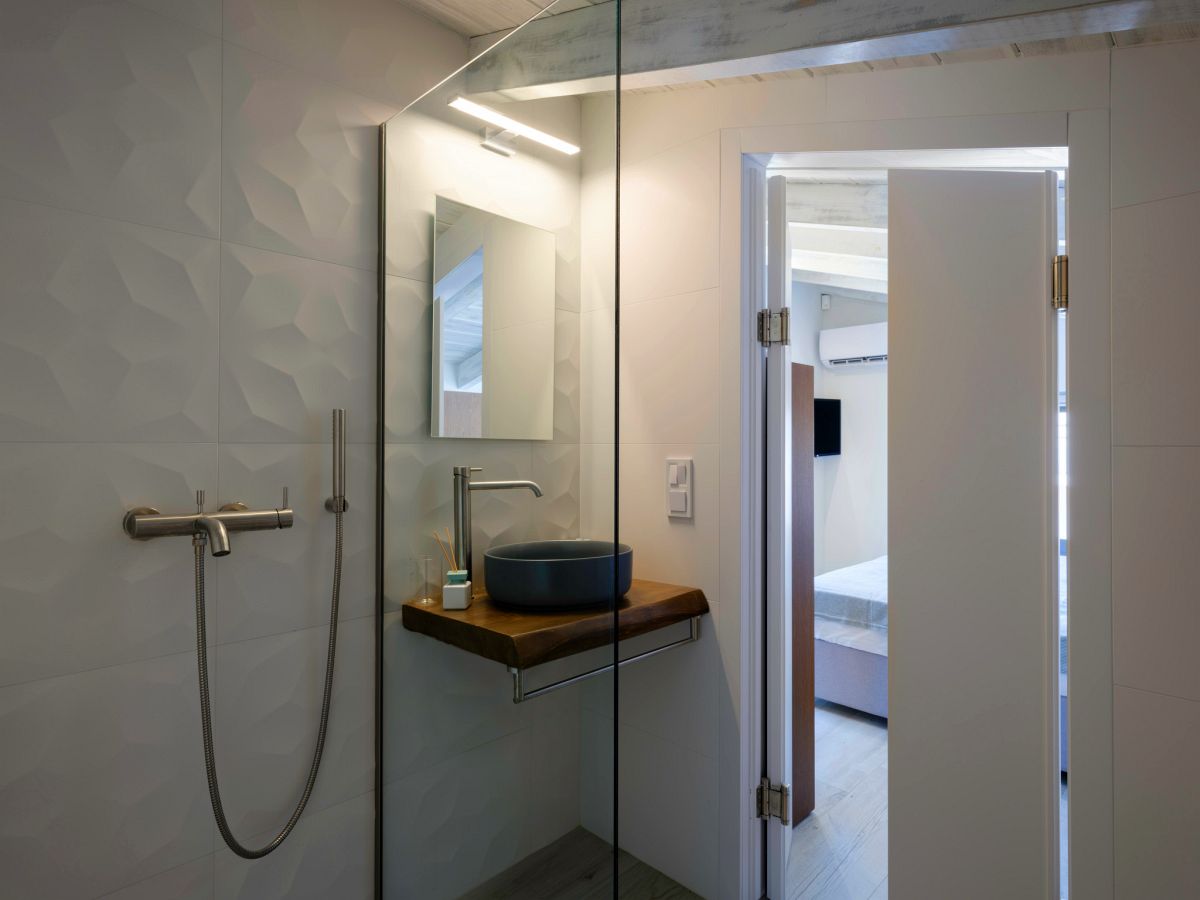 On the upper floor is the second bedroom with a nice view to the sea and two single beds. The two single beds(90x200cm) can be made as double bed upon request. That bedroom has an en-suite bathroom with shower, where is also the washing machine.