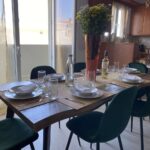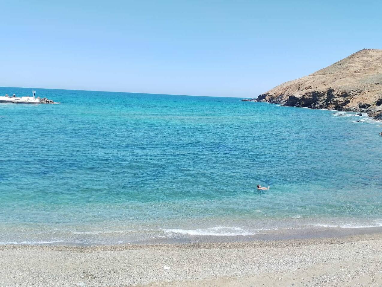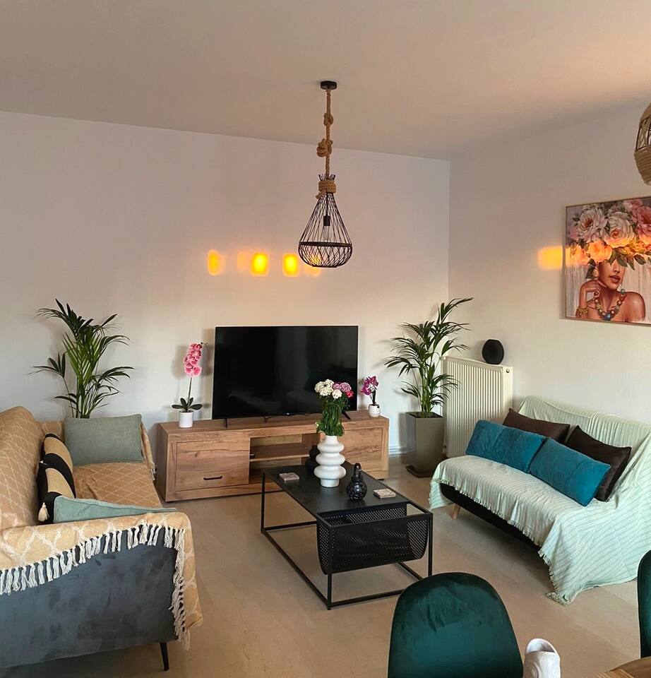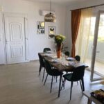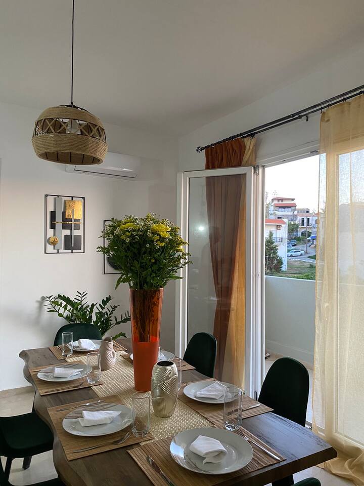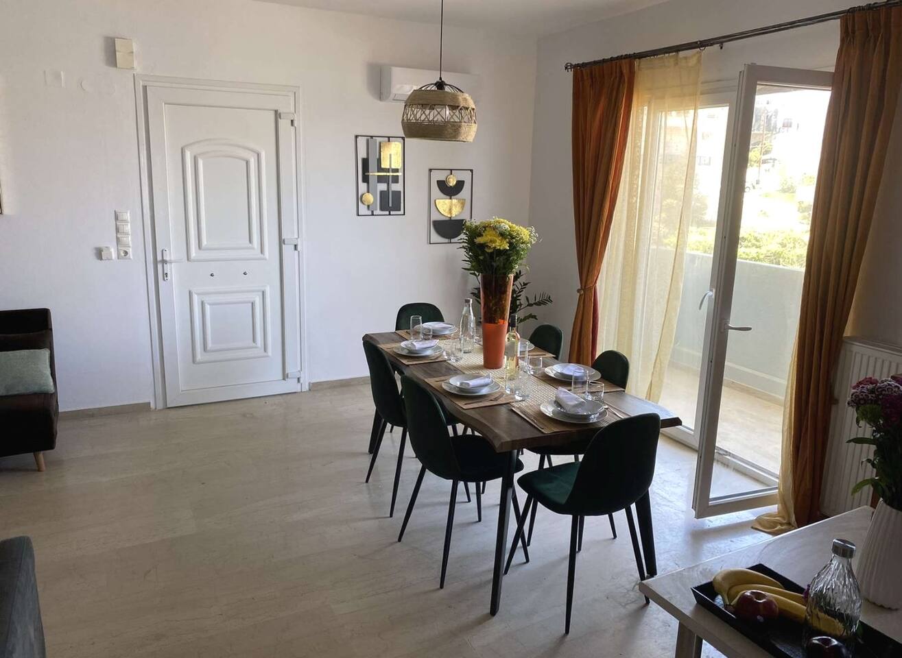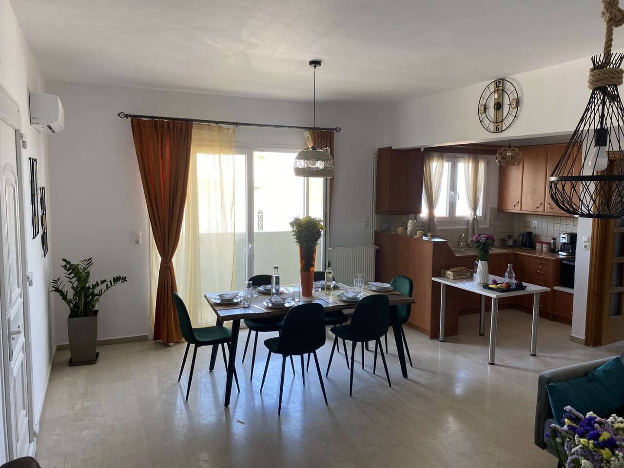 It features a fully equipped dining area, a tastefully decorated living room with TV and modern furnishings with natural textures that reflect the charm of the Cretan coast.