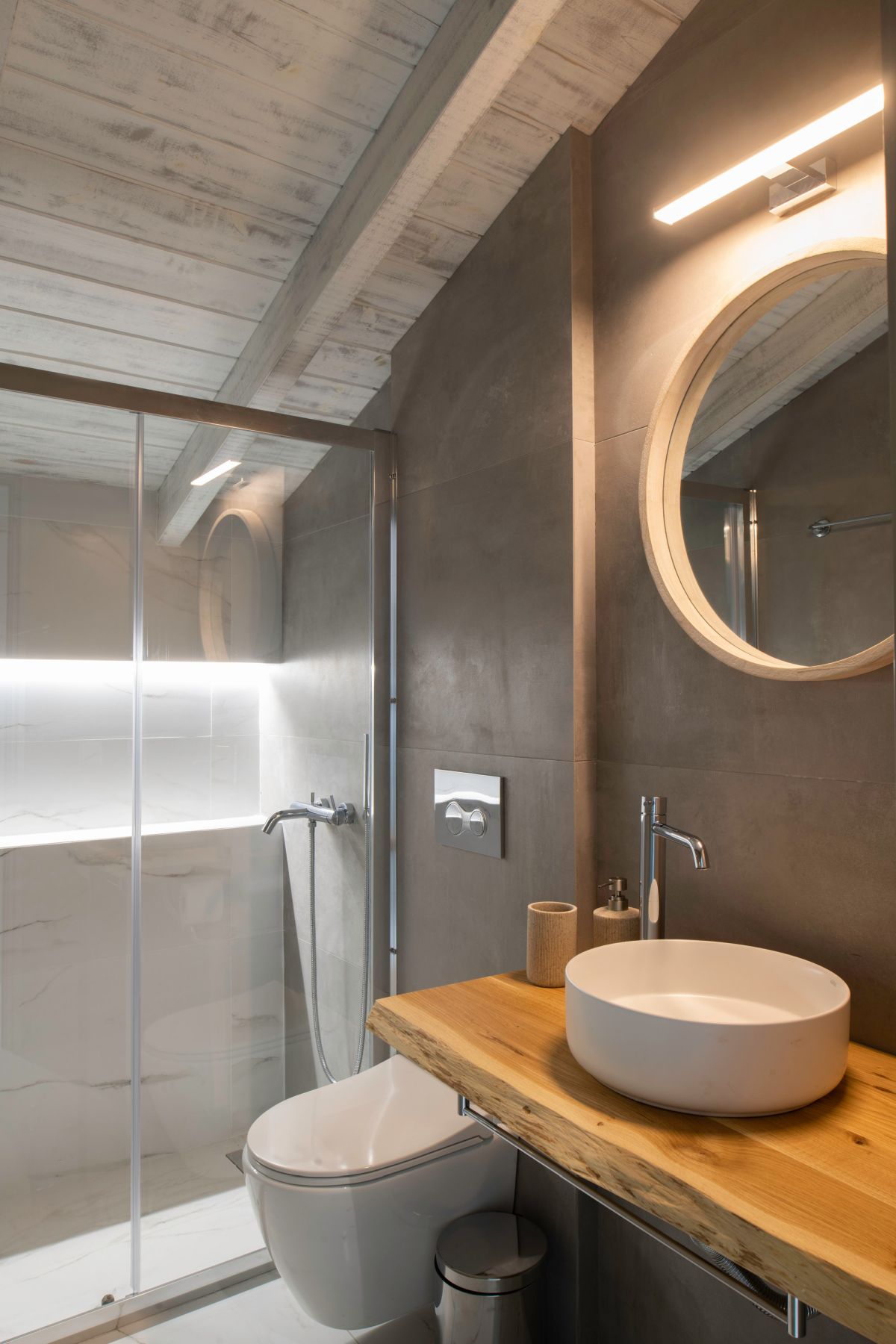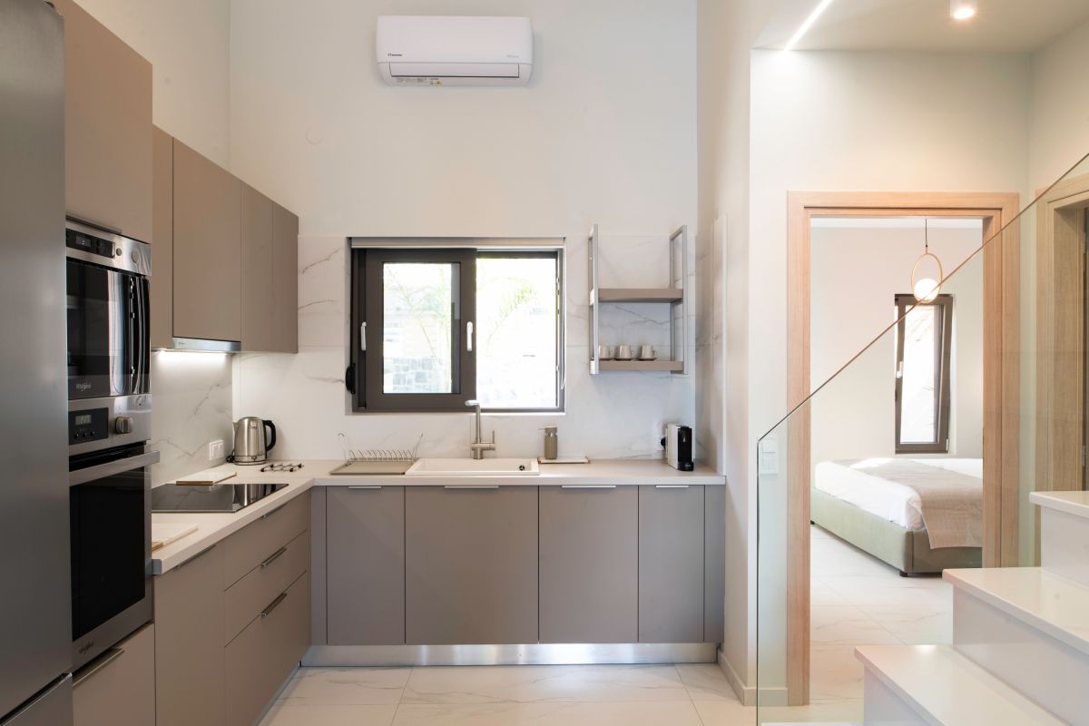 The villa consists of two floors and covers 90sqm. Entering the villa, the open space living room and fully equipped kitchen makes the house ergonomic, as moving from the kitchen to the terrace with the BBQ makes everything easy to use.