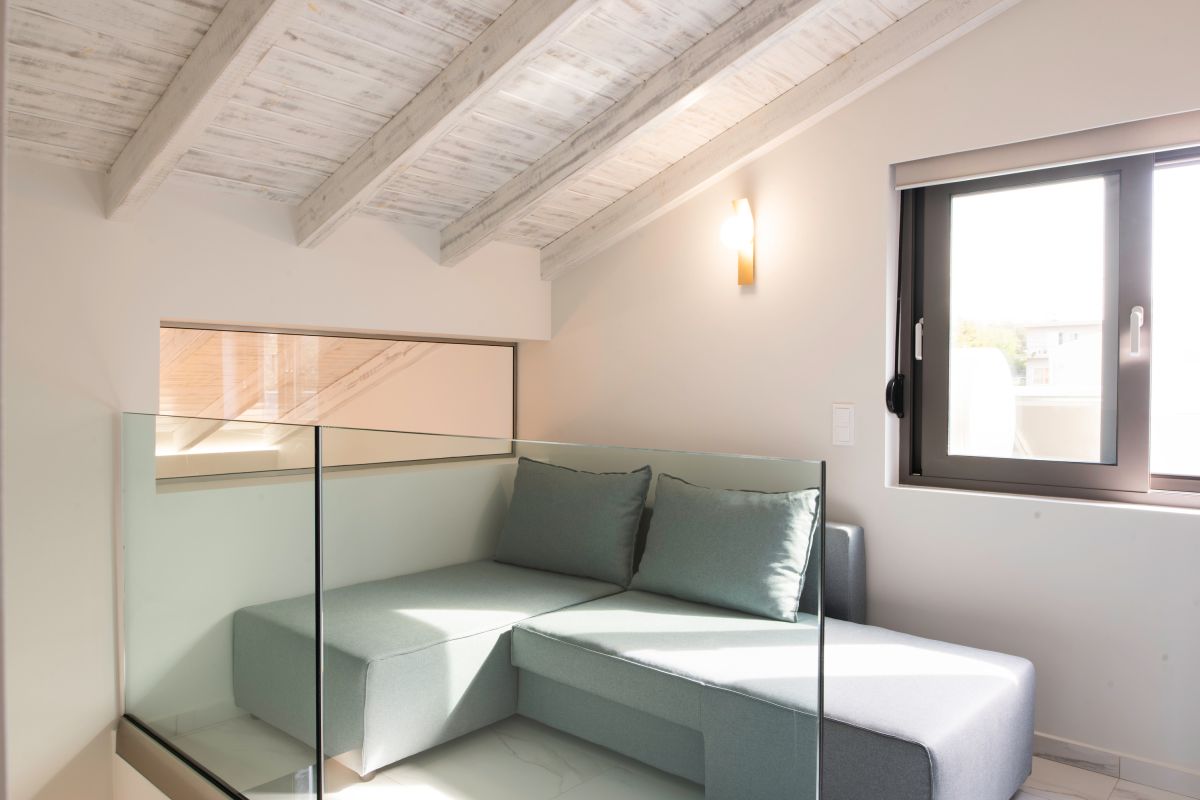 On the upper floor there is a bedroom with view to the sea. Is a bedroom with two single beds(90x200cm), which can be made as double bed upon request. That bedroom has an en-suite bathroom with shower. A small living room there is also on the upper floor with a couch which can also become a bed.